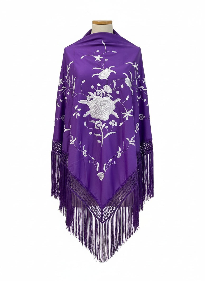 El mantón triangular morado destila personalidad y distinción. Su tonalidad profunda evoca la riqueza de la tradición flamenca con un toque de originalidad que te hará destacar en cualquier celebración.