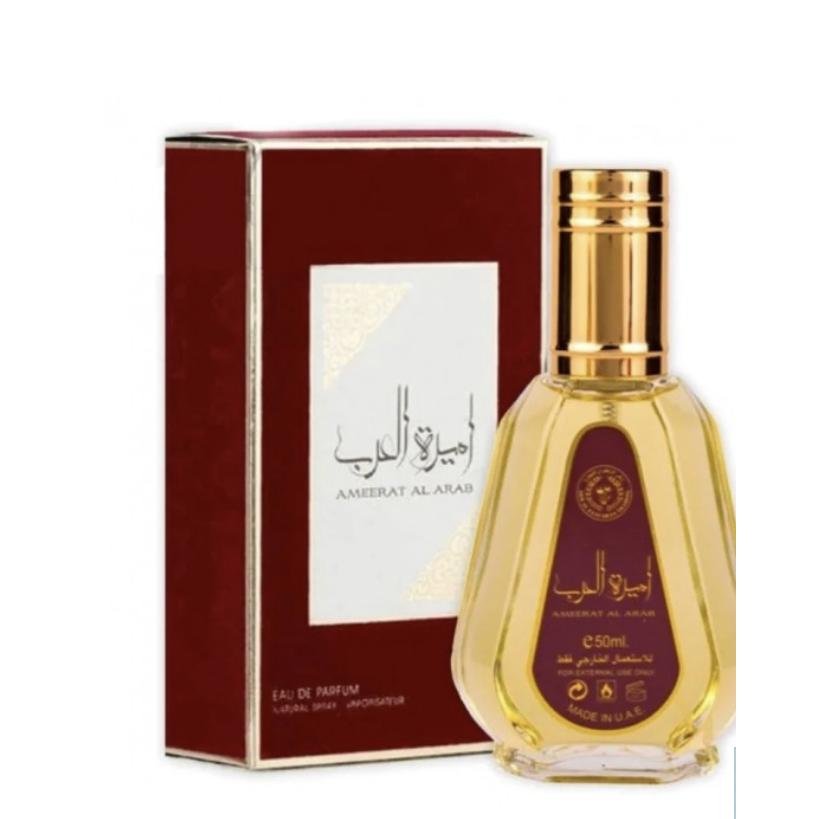 Ameerat Al Arab es un perfume árabe femenino de la familia olfativa Oriental Floral. el perfume se abre con notas frescas de uva, naranja y manzana. Estas notas crean una apertura vibrante y energizante que despierta los sentidos. Notas de salida: Uva, naranja, manzana Notas de corazón: Rosa, jazmín, nardos Notas de fondo: Sándalo, almizcle, oud Es una fragancia hermosa y elegante que es perfecta para cualquier mujer que busque un perfume dulce y duradero Contiene: 50 ML